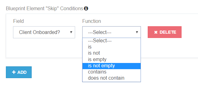 We can then set Clonedesk to skip any task within the workflow (including the task where the form was added), based selected option. To do this, go to the blueprint element that you want to be skipped, then go to the [Skip Conditions] section. Select the form field that you want from the dropdown, then select the desired function.
