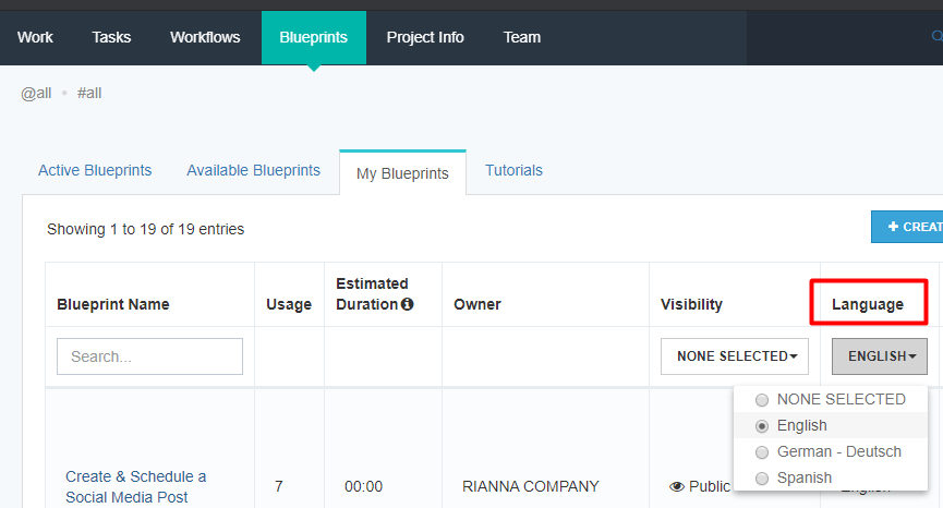 On the Blueprints Page, click the dropdown field on the Language column and select a language option to display blueprints written in that language.