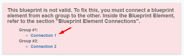 A blueprint is invalid if the connection between each blueprint group is broken. If a blueprint is invalid, this page will display information about the blueprint groups that are not connected properly. Note that you have to be the owner of the blueprint or need to have at least Organization Manager rights to edit blueprints.